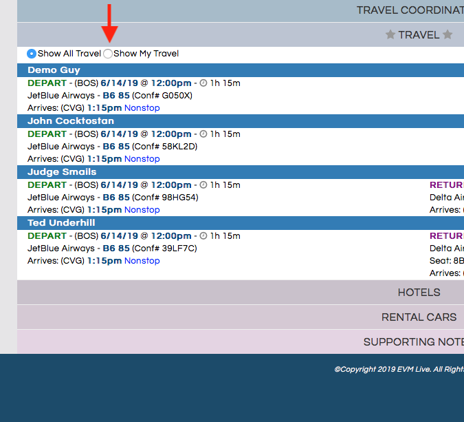 Let’s click on the Travel panel. The panel opens to reveal all of the travel associated with this event. Notice at the top of this panel there are two radio buttons. One labeled “Show all travel” and one labeled “Show my travel.” By default the system shows all travel when you arrive at an event. But if you only wish to see your travel, click that button and only your travel will be displayed.